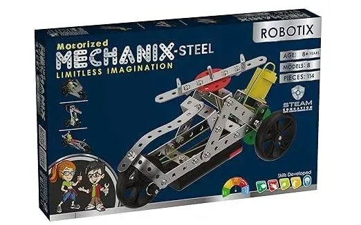 The Mechanix Robotix series is a great beginner set that gives you enough pieces to create basic objects and structures and introduces young ones to the engineering world. Mechanix Steel Robotix, a DIY STEM Toy and Steam Education Metal Construction Set (Motors & Gears), allows your child to make 8 different models one at a time.